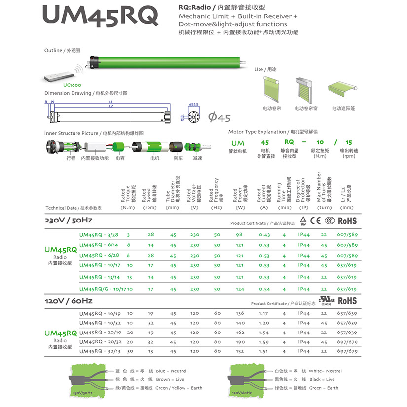 Q:Quiet/靜音型 Mechanic Limit+Integrated radio control+Jogging & tilt functions+Quiet function/機械行程限位+內置接收器+點動調光功能+靜音功能
